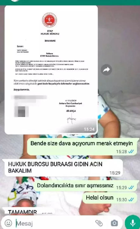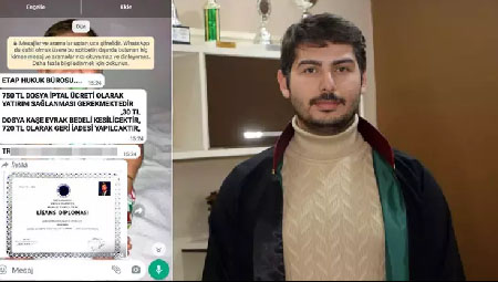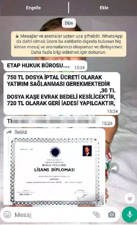 Ferhat Y.’ye WhatsApp'tan ulaşan kişi, kendisine hukuk bürosundan ulaştığını belirterek 'Dosya iptal ücreti' adı altında para talep etti. Ferhat Y. ise kendisine gelen mesaja, "Dolandırıcılıkta sınırı aşmışsınız, size dava açacağım" diye cevap verdi.