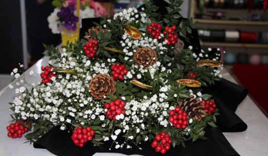 Akyol, buketin içine yüksek kesimlerden topladığı kozalakları da eklediğini belirterek, "Kozalak, kışı simgeleyen bitki. Yüksek kesimlerden kendim topladım, kurumuş limonlarla görsellik versin diye dekor amaçlı kullandım" dedi.