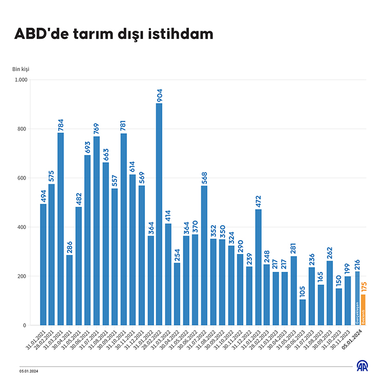 ABD Çalışma İstatistikleri Bürosu tarafından açıklanan verilere göre, 2023 yılı Aralık ayında tarım dışı istihdam 216 bin artış gösterdi. Analistlerin beklentisi istihdamda 170 bin artış olacağı yönündeydi. Tarım dışı istihdam artışı kasım ayı için 199 binden 173 bine, Ekim ayı için 150 binden 105 bine revize edildi.