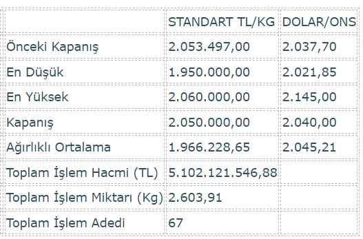 Altın piyasasında en düşük 1 milyon 950 bin lira, en yüksek 2 milyon 60 bin lirayı gören standart altının kilogram fiyatı, gün sonunda yüzde 0,2 azalışla 2 milyon 50 bin lira oldu. Standart altının kilogram fiyatı dün günü 2 milyon 53 bin 497 liradan tamamlamıştı.