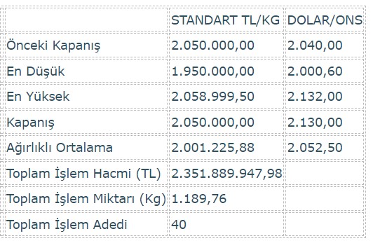 Borsa İstanbul Kıymetli Madenler ve Kıymetli Taşlar Piyasası'nda (KMKTP), altında toplam işlem hacmi 2 milyar 351 milyon 889 bin 947,98 lira, işlem miktarı ise 1.189,76 kilogram oldu.