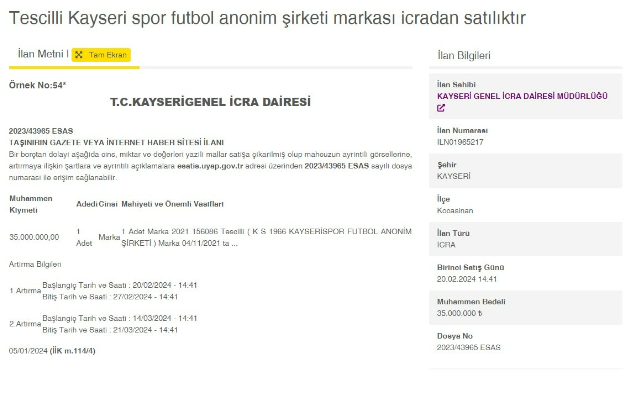 Ekonomik olarak zor günler geçiren sarı-kırmızılı kulübün tescilli markası 'Kayserispor Futbol Anonim Şirketi' borçlarından dolayı 35 milyon TL'ye satışa çıkarıldı. Kayseri Genel İcra Dairesi'nde yer alan ilana göre birinci açık arttırmanın başlangıç tarihi 20 Şubat Cumartesi günü saat 14.41, açık arttırmanın bitiş tarihi ise 27 Şubat Cumartesi saat 14.41 olarak belirlendi.
