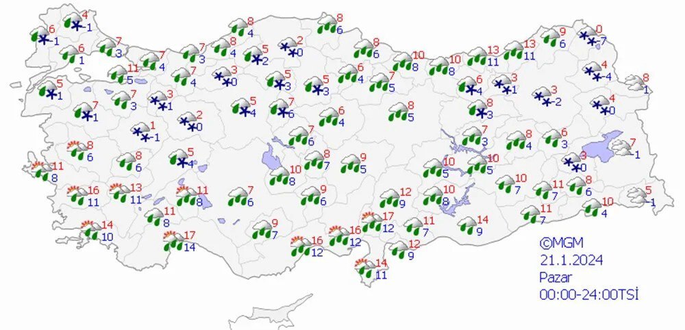 İç Anadolu'da önce Eskişehir'de, pazar öğleden sonra Sivas, Kayseri tarafina kar yağacak. Eskişehir 1, Kayseri 9 derece. Pazartesi kuru soğuk ve don oluşacak.
