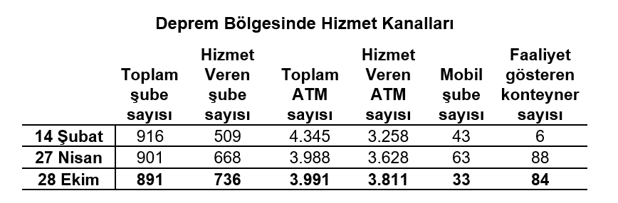 Depremden yaklaşık üç ay sonra, nisan ayı sonunda bankacılık hizmeti deprem öncesi seviyesine yaklaşmıştır. Uzaktan kanallarla verilen bankacılık hizmeti kesintisiz devam ederken; fiziksel şubeler, geçici/konteyner şubeler ve ATM’ler aracılığıyla sağlanan bankacılık hizmetleri ile bölge, deprem öncesi hizmet seviyesine yakın hale getirilmiştir.
