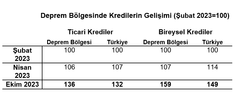 Deprem felaketinin ardından bankacılık sektörü tarafından bölgeye finansman desteği sürekli olarak sağlanmıştır. Bölgeye sağlanan kredilerin büyümesi Türkiye ortalamasının üzerinde gerçekleşmiştir. Deprem gününden ekim ayı sonuna kadar Türkiye genelinde ticari krediler yüzde 32 büyürken deprem bölgesindeki büyüme yüzde 36 olmuştur. Bireysel kredilerde de bölgenin kredi büyümesi Türkiye genelinden 10 puan daha yüksek olmuştur.