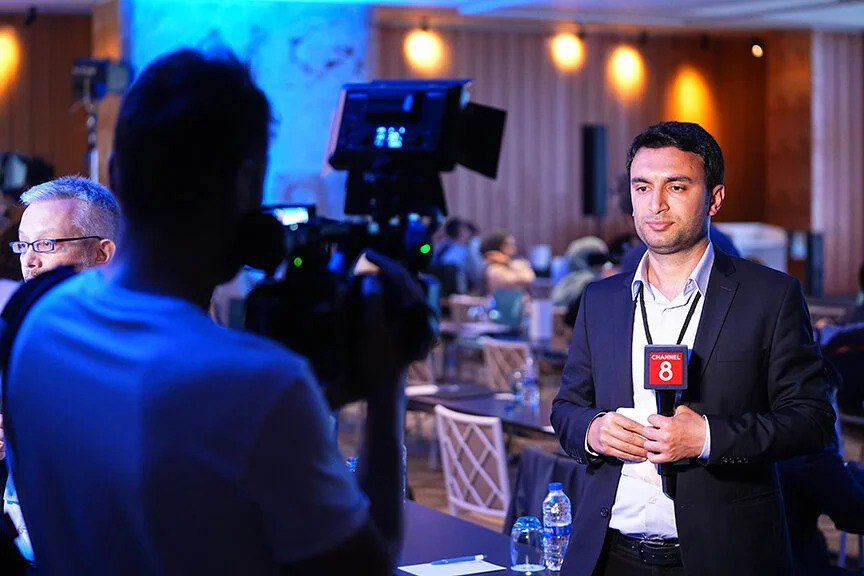 Yerli ve yabancı basın mensuplarının, gün içindeki gelişmeler ile sandıklar kapandıktan sonra oy sayım sürecini takip etmesi için açılan merkezde, haber kanallarının yayınları dijital ekrana yansıtılıyor.