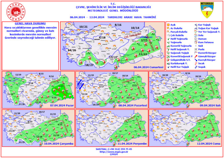 Bugün yurdun kuzey, iç ve doğu kesimlerinin parçalı ve yer yer çok bulutlu, Trakya, Batı ve Orta Akdeniz'in iç kesimleri, Doğu Anadolu (Ardahan ve Erzincan haric), Güney Doğu Anadolu (Mardin haric) ile İstanbul ve Hatay çevrelerinin sağanak ve yer yer gök gürültülü sağanak yağışlı, Doğu Anadolu'nun doğusunun yükseklerinin karla karışık yağmurlu geçeceği tahmin ediliyor.