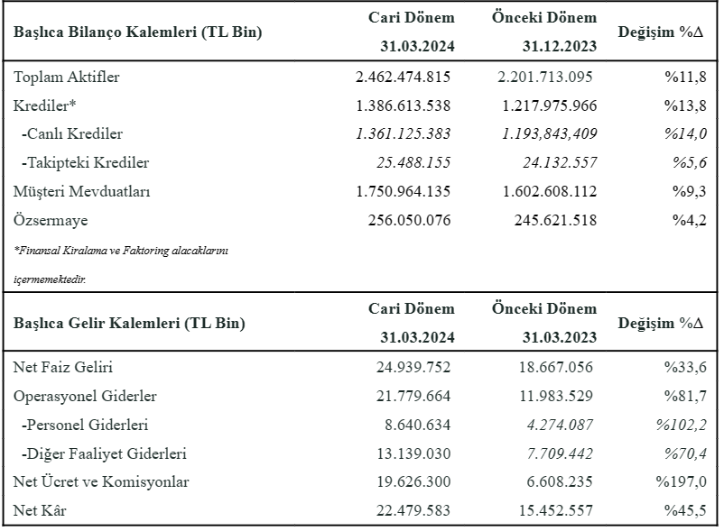 Türkiye Garanti Bankası A.Ş. (#GARAN), 31 Mart 2024 tarihli finansal tablolarını açıkladı. Bankanın konsolide finansal tablolarına göre, yılın ilk 3 ayında, net kârı 22 milyar 479 milyon 583 bin TL oldu. Aktif büyüklüğü 2 trilyon 462 milyar 474 milyon 815 bin TL seviyesinde gerçekleşirken, ekonomiye nakdi ve gayri nakdi krediler aracılığıyla sağladığı destek ise 1 trilyon 853 milyar 956 milyon 245 bin TL oldu.