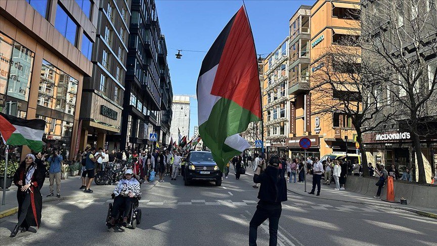 İsveç Dışişleri Bakanlığı önünde toplanan yüzlerce kişi, İsveç'in Malmö kentinde yapılacak Eurovision Şarkı Yarışması'nda İsrail'in boykot edilmesini talep etti.