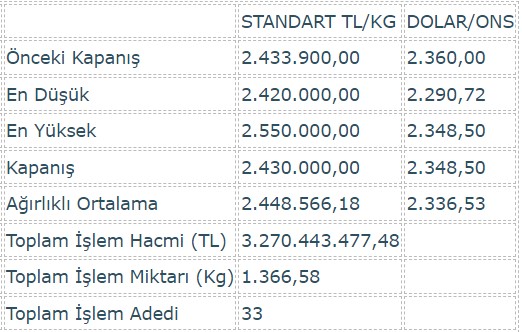 Altın piyasasında en düşük 2 milyon 420 bin lirayı, en yüksek 2 milyon 550 bin gören standart altının kilogram fiyatı, gün sonunda yüzde 0,2 azalışla 2 milyon 430 bin lira oldu. Dün, standart altının kilogram fiyatı günü 2 milyon 433 bin 900 liradan tamamlamıştı.