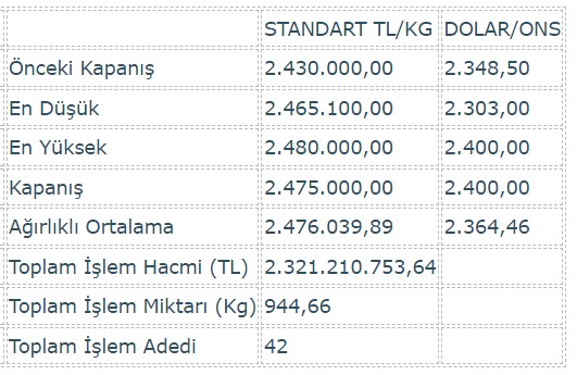 Tüm metallerde toplam işlem hacmi ise 2 milyar 374 milyon 566 bin 936,18 lira olarak gerçekleşti.