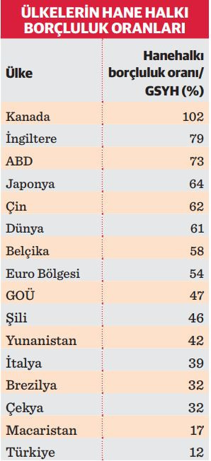 Türkiye’de artan borçluluk oranı dönem dönem kamuoyunda tartışma konusu oluyor. Hane halkının borçluluk oranı dünya ile karşılaştırıldığında oldukça düşük seviyelerde. Türkiye’de hane halkının toplam borcunun milli gelire oranı yüzde 12 düzeyinde. Bu oran Kanada’da yüzde 102, İngiltere’de yüzde 79, ABD’de yüzde 73, Japonya’da yüzde 62. Hane halkı borçlarının milli gelire oranı dünyada ortalama yüzde 61, gelişmekte olan ülkelerde yüzde 47, Euro Bölgesi’nde ise yüzde 54.
