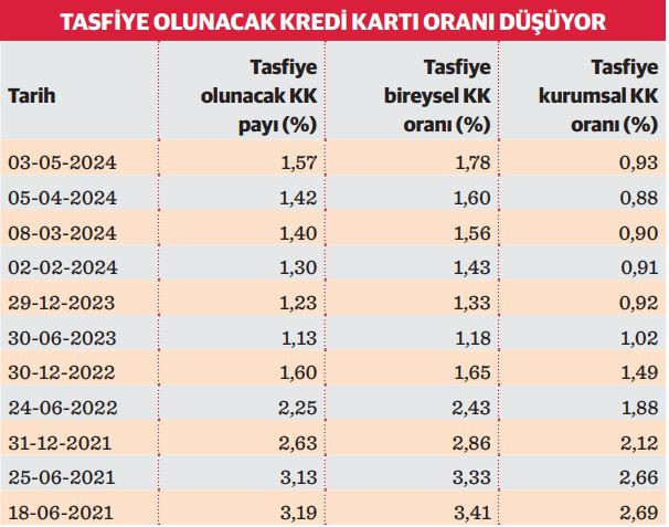 Peki kredi kartı kullanımında son yıllarda tam anlamıyla ‘patlama’ yaşanması ödemelerde bir soruna neden oldu mu? Dünya'dan Ufuk Korcan'ın haberine göre, tasfiye olunacak kredi kartı tutarı 29.2 milyar TL’ye tırmansa da rakamlar kart kullanımının arttığı son yıllarda tasfiye olunacak oranın azaldığını gösteriyor. 2021 yılında bireysel ve kurumsal kredi kartlarında tasfiye olunacak kartların oranı yüzde 3.19 seviyesindeyken 3 Mayıs itibarıyla bu oran yüzde 1.57 olarak hesaplandı. Bireysel kredi kartlarında 2021’de yüzde 3.41 olan tasfiye olunacak kart oranı yüzde 1.78’e, kurumsal kartlarda yüzde 2.69’tan yüzde 0.93’e geriledi. Yani vatandaşlar kart harcamalarını artırmasına rağmen ödemelerini zamanında yapıyor. Tabi bu oranlarda geçmiş ile günümüzde yapılan kart ödemelerinin asgari ya da borcun tamamı şeklinde yapılıp yapılmadığının ayrıntısı yok.