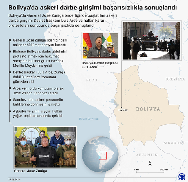 Öte yandan Bolivya'da başarısız olan darbe girişimine katılan çok sayıda subayın tutuklandığı ve 15 ile 30 yıl arasında hapis cezası alabileceği açıklandı.