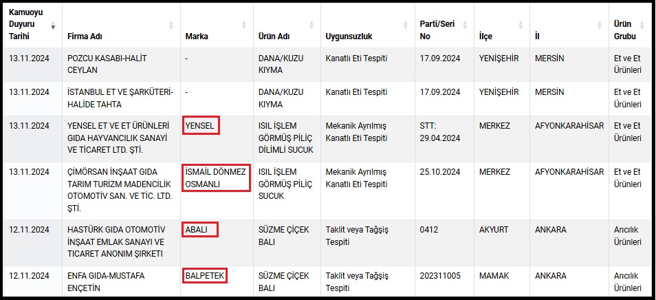 İşte Tarım ve Orman Bakanlığı tarafından açıklanan taklit ve tağşiş listesi: