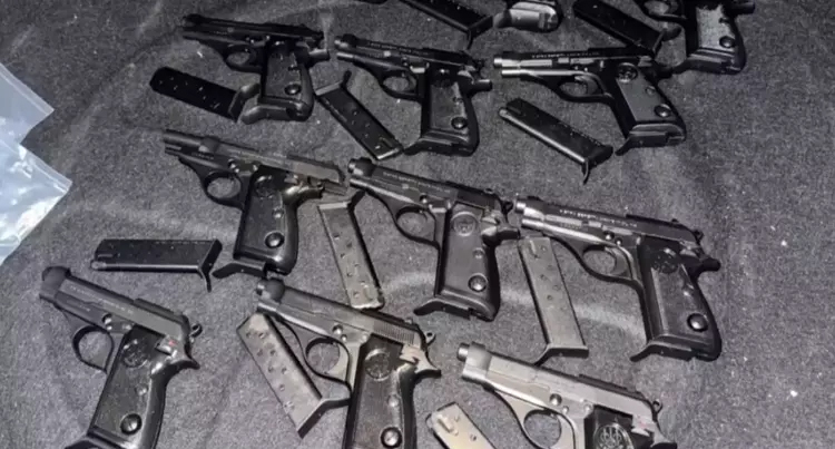 Adreslerde yapılan aramalarda ise 100 ruhsatsız tabanca ve şarjör, 11 fişek, 2 av tüfeği, 2 şeffaf poşetler içerisinde 10'ar gram kokain ve marihuana ile sahte plaka ele geçirildi.