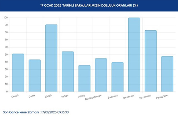 İstanbul’da etkili olan sağanak yağış ve kar yağışı, barajlardaki su seviyelerini artırdı. İstanbul Su ve Kanalizasyon İdaresi (İSKİ), 17 Ocak 2025 itibarıyla güncel baraj doluluk oranlarını açıkladı.