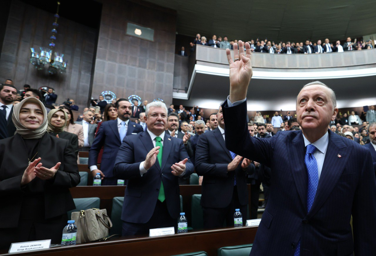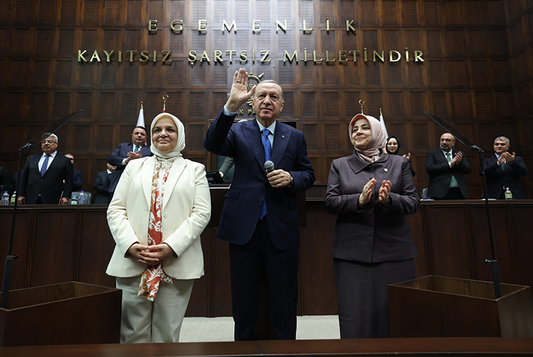 Konuşmasına, "Filistin’den Suriye’ye, Kafkasya’dan Balkanlar’a, Afrika’dan Türkistan’a kadar gönül ve kültür coğrafyamızın dört bir yanında, hayata tutunma mücadelesi veren tüm kardeşlerimi de buradan Kemal-i hürmetle selamlıyorum. Filistin’den Suriye’ye, Kafkasya’dan Balkanlar’a, Afrika’dan Türkistan’a kadar gönül ve kültür coğrafyamızın dört bir yanında, hayata tutunma mücadelesi veren tüm kardeşlerimi de buradan Kemal-i hürmetle selamlıyorum." diyerek başlayan Erdoğan, AK Parti TBMM grup toplantısının hayırlara vesile olmasını diledi.