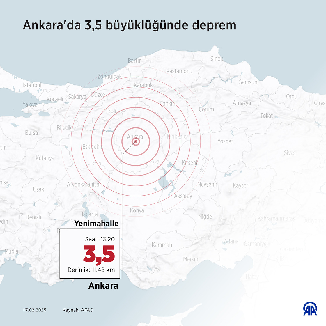 Afet ve Acil Durum Yönetimi Başkanlığının (AFAD) internet sitesinde yer alan bilgiye göre, Ankara'nın Yenimahalle ilçesinde saat 13.20'de 3,5 büyüklüğünde deprem kaydedildi.