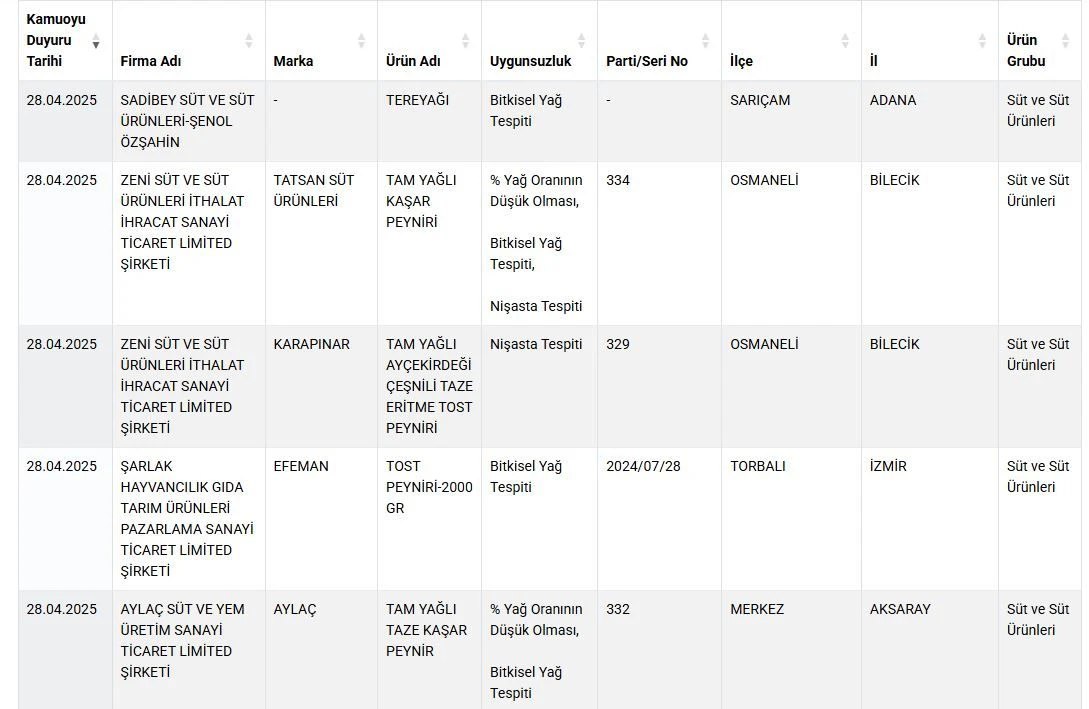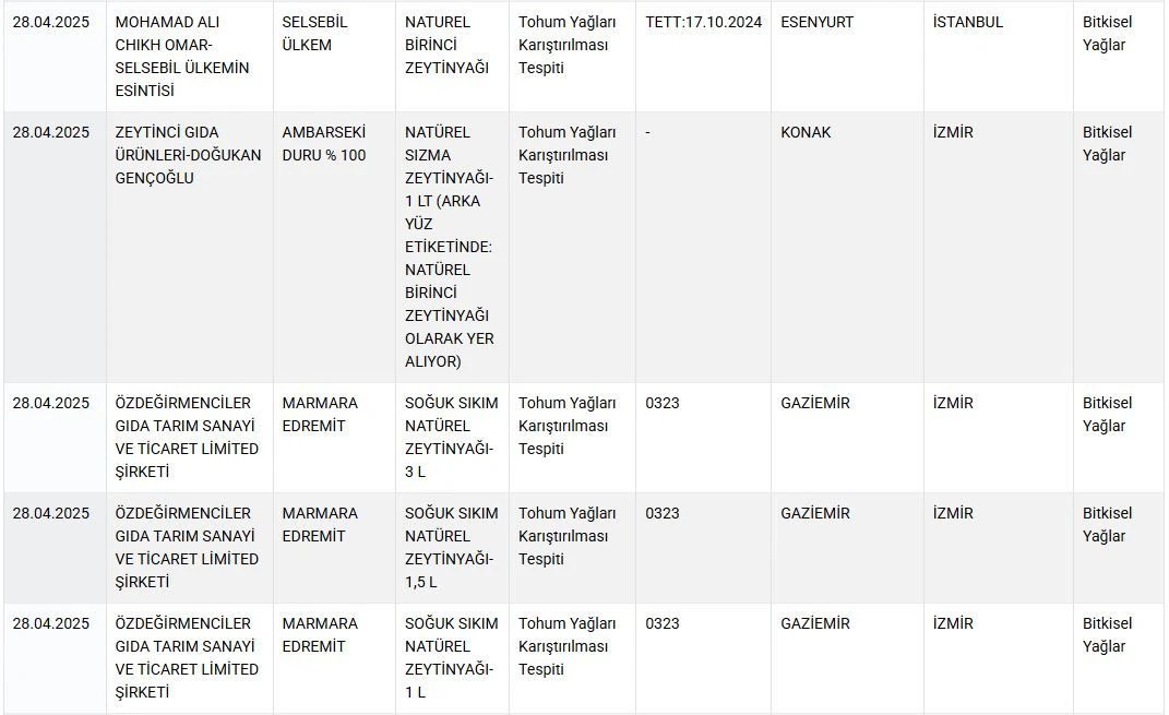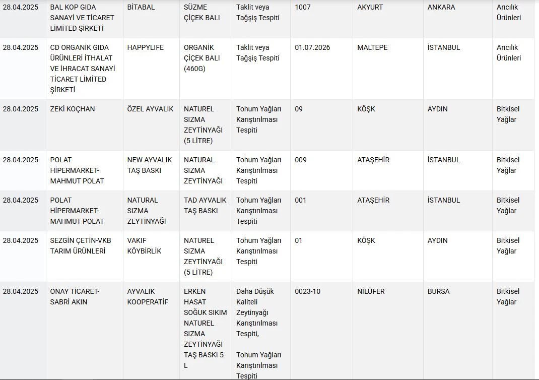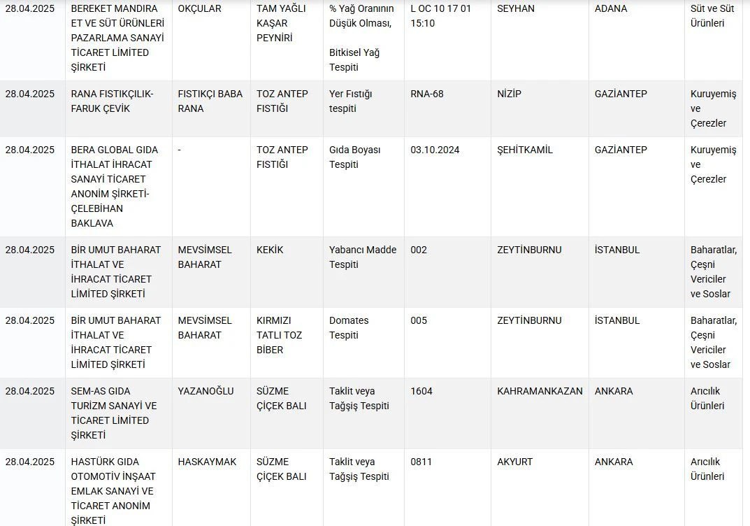 Tarım ve Orman Bakanlığı, gıda güvenliği kapsamında yürüttüğü denetimlerin ardından sahtecilik yapan markaları bir kez daha ifşa etti. Son açıklanan listede, sağlığı tehdit edecek şekilde tağşiş ve taklit yapılan baharat, yağ, bitkisel ürün, peynir ve bal ürünleri yer aldı.