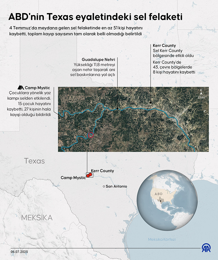 Yetkililer, Kerr County'de 43, çevre bölgelerde de 8 kişinin sellerde hayatını kaybettiğini, toplam kayıp sayısının ise tam olarak belli olmadığını kaydetti.