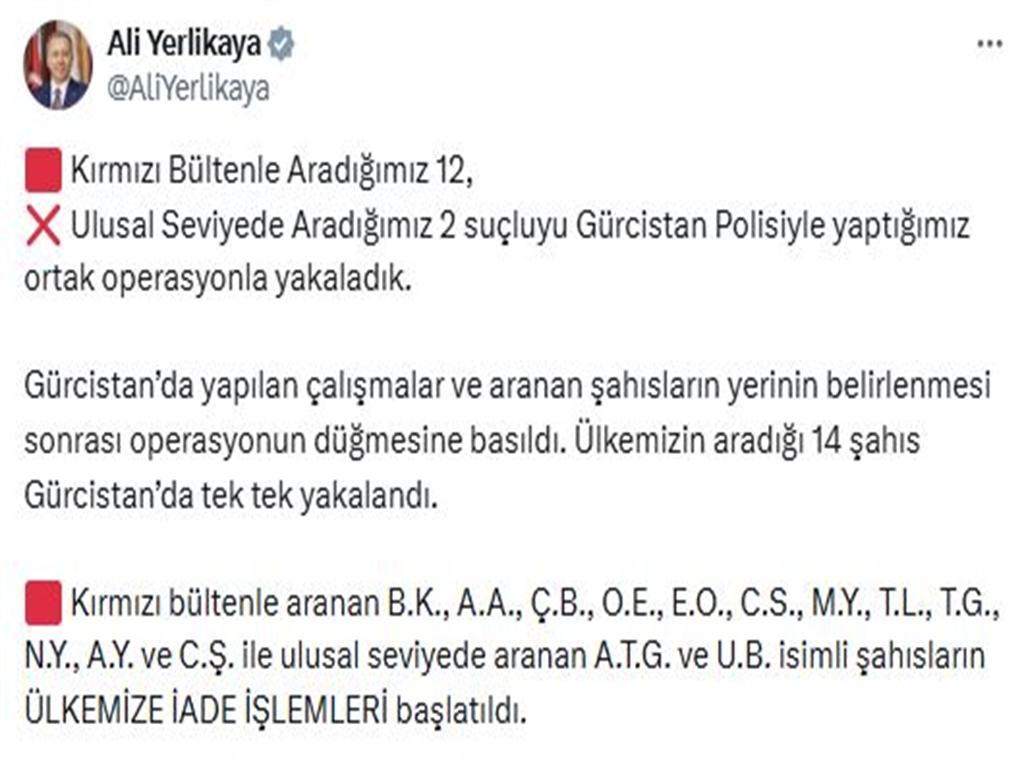 Yerlikaya, sosyal medya platformu Next Sosyal'den yaptığı paylaşımda, "Kırmızı bültenle aradığımız 12, ulusal seviyede aradığımız 2 suçluyu Gürcistan polisiyle yaptığımız ortak operasyonla yakaladık. Gürcistan'da yapılan çalışmalar ve aranan şahısların yerinin belirlenmesi sonrası operasyonun düğmesine basıldı. Ülkemizin aradığı 14 şahıs Gürcistan'da tek tek yakalandı." ifadelerini kullandı.