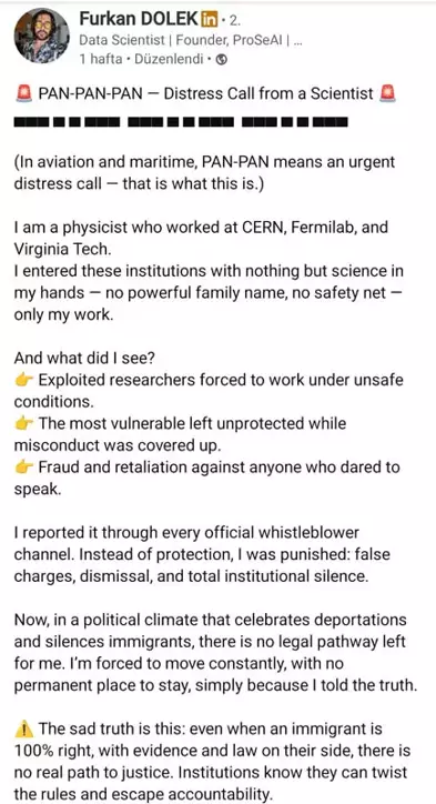 Çukurova Üniversitesi Fizik Bölümü’nde yüksek lisansını tamamlayıp, özel bursla gittiği İsviçre’de doktorasını tamamlayan Dr. Furkan Dölek, 2023 yılında akademik çalışmaları için davet edildiği ABD’nin Virgina Tech Üniversitesi’ne gitti. Ayrıca Avrupa Nükleer Araştırma Merkezi’nde de (CERN) araştırma görevi yapan Dr. Dölek, son olarak çalıştığı ABD Enerji Bakanlığı’na bağlı Fermilab’ta iddiaya göre bazı usulsüzlükler ve güvenlik açıkları tespit etti. Tespitlerini bakanlığa bildiren Dr. Dölek'in, baskı ve mobbinge maruz kaldığı öne sürüldü.