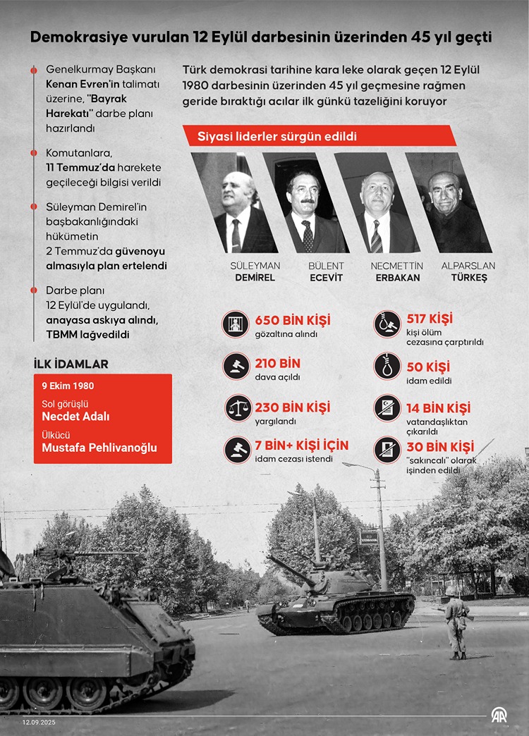Tarihler 12 Eylül'ü gösterdiğinde, Türk demokrasisine darbe vuracak plan, sabaha karşı uygulandı. 12 Eylül sabahı, Genelkurmay Başkanı Orgeneral Kenan Evren'in radyodan okuduğu bildiriyle Türkiye, karanlık bir döneme uyandı.