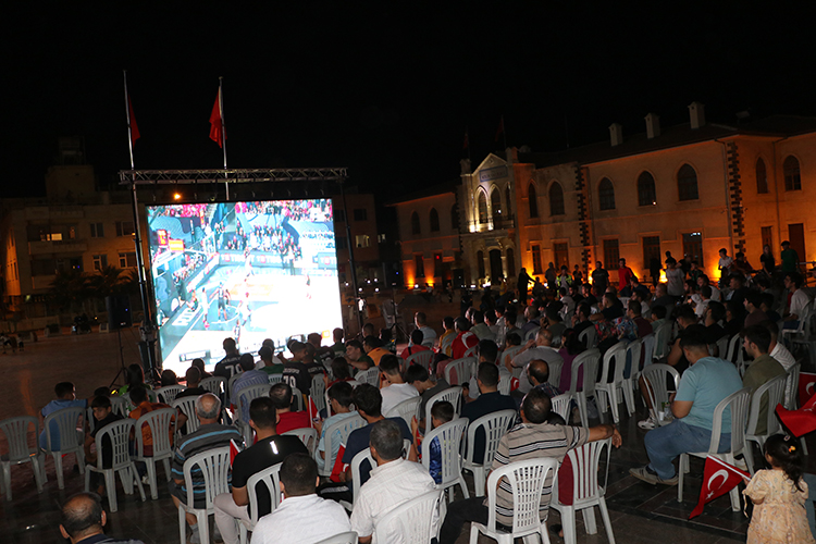 Maçı kurulan dev ekrandan izlemek için gelen vatandaşlar, müsabakanın başında İstiklal Marşı'nı okudu ve ardından A Milli Basketbol Takımı lehine tezahüratta bulundu.
