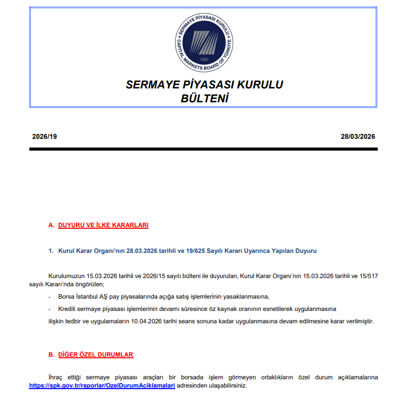 Kuruldan yapılan açıklamada, 28 Mart 2026 tarihli ve 19/625 sayılı karar uyarınca, daha önce 15 Mart 2026’da yürürlüğe giren tedbirlerin uygulanmasına devam edileceği belirtildi. Bu kapsamda açığa satış işlemlerinin yasaklanması uygulamasının süreceği vurgulandı.