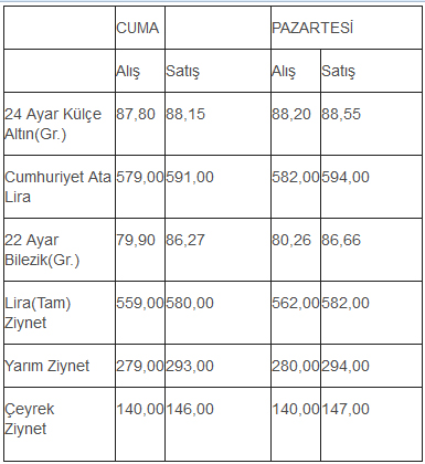 stanbul Kapalıçarşı'da 24 ayar külçe altının gram satış fiyatı 88,55 lira, Cumhuriyet altınının satış fiyatı ise 594,00 lira oldu. İstanbul Kapalıçarşı'da alınıp satılan altın türlerinin, önceki kapanış ve bugün açılış fiyatları (TL) şöyle: