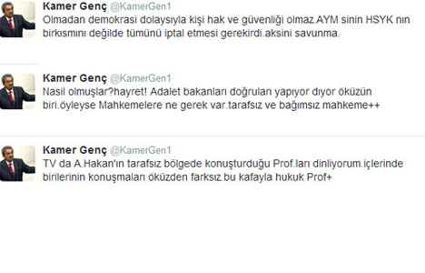 Twitter hesabından 'Ahmet Hakan'ın Tarafsız Bölge'de konuşturduğı profesörleri dinliyorum. İçlerinden birinin konuşması öküzden farksız. Bu kafayla hukuk profesörü nasıl olmuşlar hayret! 'Adalet bakanları doğruları yapıyor' diyor öküzün biri. Öyleyse mahkemelere ne gerek var. Tarafsız ve bağımsız mahkeme olmadan demokrasi dolayısıyla kişi hak ve güvenliği olmadan AYM'nin HSYK'nın bir kısmını değil de tümünü iptal etmesi gerekirdi. Aksini savunma." eleştirisinde bulundu.