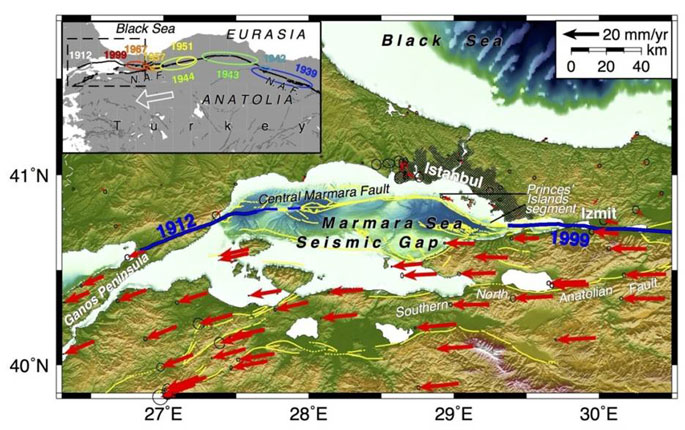 Marmara Bölgesi’ndeki 25 yıllık referansa ait Avrasya kökenli GPS hız alanı Mavi ile gösterilen fay kolları üzerindeki tarihler o bölgede olmuş olan son depremlerin tarihini göstermektedir. Halen kırılmamış ve deprem üretme potansiyeli olan bölüm Marmara Denizi içinde bulunmaktadır.