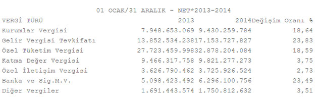 Vergiler arasında aslan payına sahip olan Özel Tüketim Vergisi (ÖTV) ise büyük mükellefler için bir yılda yüzde 18,59 arttı. Bu artış, 2013'te ödenen 27 milyar 723 milyon liranın 32 milyar 878 milyon liraya çıkmasını sağladı.