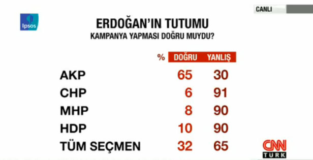 IPSOS, 7 Haziran seçimleri sonrası 1572 ile gerçekleştirdiği anketin sonuçlarını kamuoyu ile paylaştı. CNN Türk'te Şirin Payzın'ın hazırlayıp sunduğu programda açıklanan sonuçlara göre HDP'ye oy verenlerin yüzde 22'lik bölümü, kararını son bir hafta içerisinde vermiş. Bu verilere göre HDP, barajı son bir hafta içerisinde açmış.