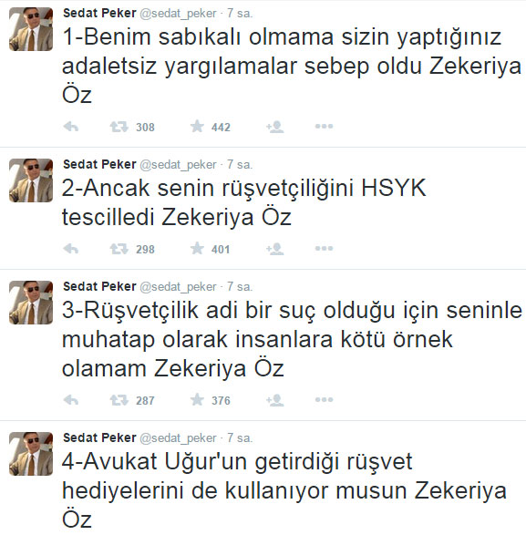 Sabıkalı olmasının nedenini, adaletsiz yargılamalara bağlayan ve bundan dolayı da Zekeriya Öz'ü suçlayan Peker, ihraç edilen Öz'ün rüşvetçi olduğunu iddia etti. İşte Peker'in tweetleri;