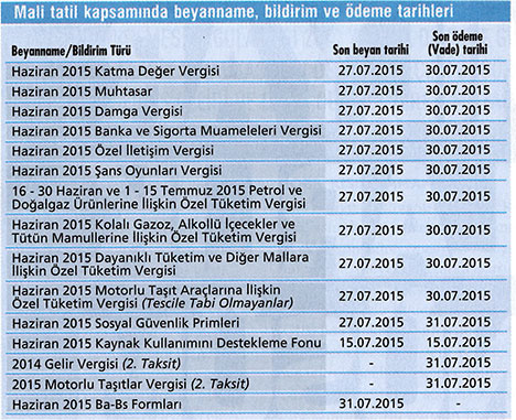 2013 yılında elde edilen gelirler için Mart ayında beyanname verildi. Beyanname üzerinde gösterilen verginin ikinci taksitinin 31 Temmuz Cuma akşamına kadar ödenmesi gerekiyor. Aynı şekilde motorlu taşıt vergilerinin (taşıt pulu) ikinci taksiti de Temmuz sonuna kadar ödenecek. Mali tatilin bu ödeme sürelerine herhangi bir etkisi olmuyor.