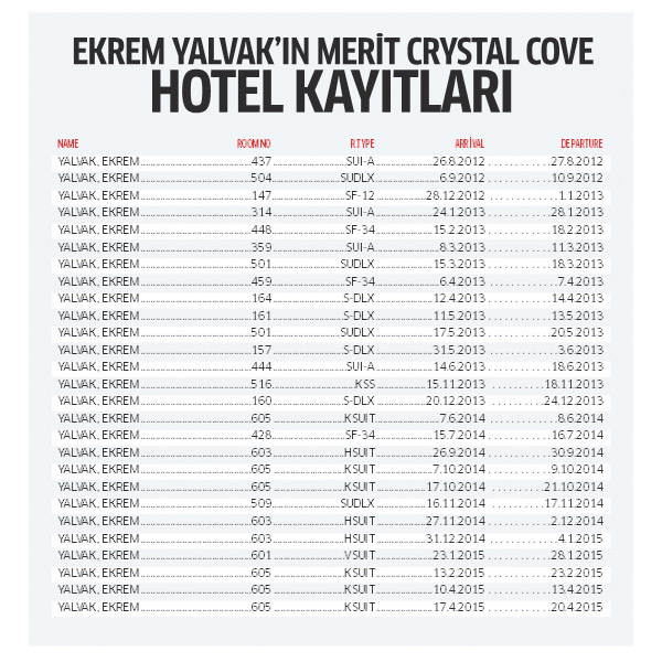 Haberde ayrıca Yalvak'a ait olduğu iddia edilen Girne'deki Merit Crystal Cove Hotel kayıtları yer alıyor.