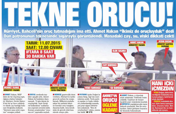 Gazete, “Tekne orucu” başlığıyla manşetten verdiği haberde, “Hürriyet, Bahçeli’nin oruç tutmadığını ima etti. Ahmet Hakan ‘İkimiz de oruçlukduk’ dedi. Dün patronunun teknesinin sigarayla göürntülendi. Masadaki çay, su, viski dikkat çekti” diye yazdı.
