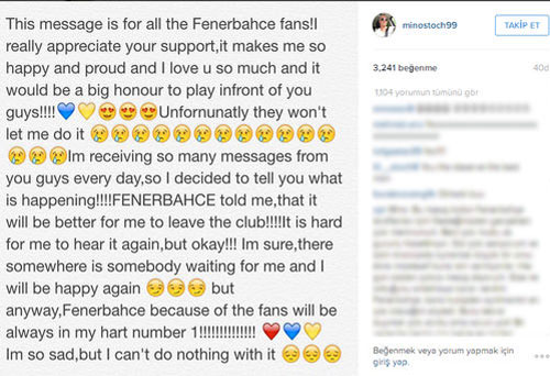 "Bu mesaj bütün Fenerbahçe taraftarları için! Desteğinizden gerçekten çok memnunum. Beni çok mutlu ve gururlu hissettiriyor. Sizi çok seviyorum ve sizin önünüzde oynamak büyük bir onur. Ama maalesef buna izin vermiyorlar. Her gün sizden çokca mesaj alıyorum. Size ne olduğunu anlatmaya karar verdim. Fenerbahçe, bana kulüpten ayrılmamın en iyisi olacağını söyledi. Bunu tekrar duymak çok zordu ama sorun yok! Bir yerlerde benim için bekleyen birileri olduğuna ve tekrar mutlu olacağıma eminim. Ama neyse Fenerbahçe, taraftarlardan dolayı kalbimde her zaman 1 numara olacak. Çok üzgünüm ama bu konuda yapabileceğim bir şey yok.”