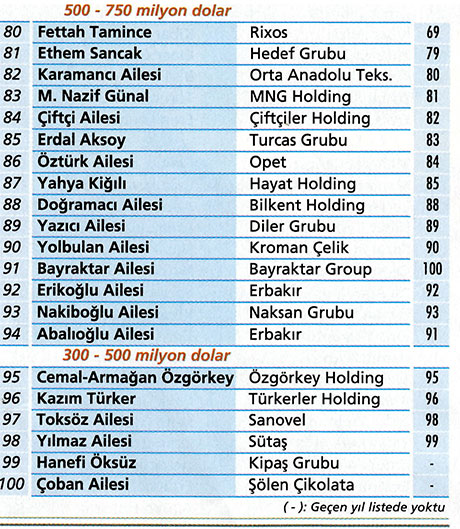 Listede kategori düşenler de oldu. Enka hisselerinde-ki değer kaybı ve üstlendiği müteahhitlik işlerinin azalmasıyla birlikte Tara Ailesi, bir alt sıraya indi. Boydak Ailesi de bir kategori düştü. Çarmıklı Ailesi, Ali Ağaoğlu, Gürsel Ailesi ve Fettah Tamince de alt kategorilere düşen aileler arasında yer aldı.