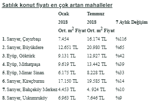 Hürriyet Emlak ilanları üzerinden oluşturulan verilere göre Yeni Havalimanı güzergahındaki Sarıyer Çayırbaşı Mahallesi, Ocak 2018’den Temmuz 2018’e satılık konut fiyatlarında gerçekleşen yüzde 116’lık artışla liste başında yer aldı.