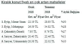 Kiraların en çok arttığı mahallelerin başında yüzde 30 ile Mimar Sinan gelirken, bu mahalleyi Mithatpaşa (%28), Ömerli (%27), Zekeriyaköy (%11) ve Uskumruköy (%10) izledi.
