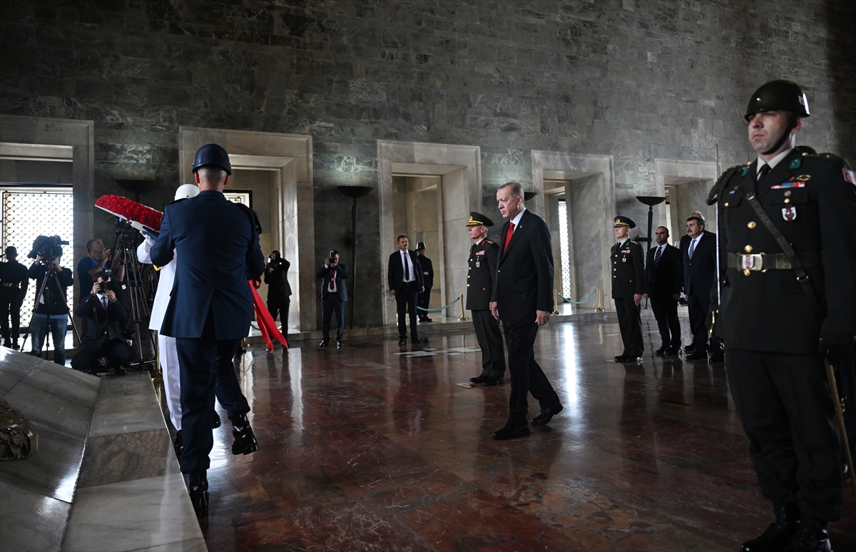 Cumhurbaşkanı Erdoğan ve beraberindeki heyet Atatürk'ün huzuruna çıktı. Cumhurbaşkanı Erdoğan, Atatürk'ün mozolesine çiçek bıraktı. Erdoğan ve beraberindeki heyet saygı duruşunda bulunurken, İstiklal Marşı okundu.