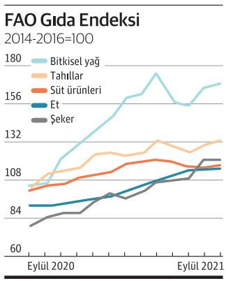 Analistler hem enerji fiyatlarındaki artışın üretim maliyetlerini yükseltmesi, hem de elverişsiz hava şartlarının üretimi baltalaması nedeniyle tahıl fiyatlarındaki artışın süreceği uyarısı yapıyor. Uluslararası vadeli işlemlerde buğdayın fiyatı son 1 yılda yüzde 30 artarken, mısır fiyatları yüzde 43, şekerin fiyatı yüzde 35, kahve fiyatları da yüzde 95 yükseldi. Birleşmiş Milletler Tarım Örgütü (FAO) Gıda Endeksi eylülde, geçen yılın aynı dönemine oranla yüzde 32.8 arttı. FAO’nun tahıl endeksi yüzde 27.3, yağ endeksi ise yüzde 60 yükseldi. Agflasyon, birçok hükümet için giderek daha önemli bir konu haline gelmeye başladı. Özellikle insanların gelirinin önemli bir bölümünü gıdaya harcadığı az gelişmiş ya da gelişmekte olan ülkelerde, agflasyonun gıda güvenliğini tehlikeye sokabileceği ve toplumsal huzursuzluğa neden olabileceği belirtiliyor.