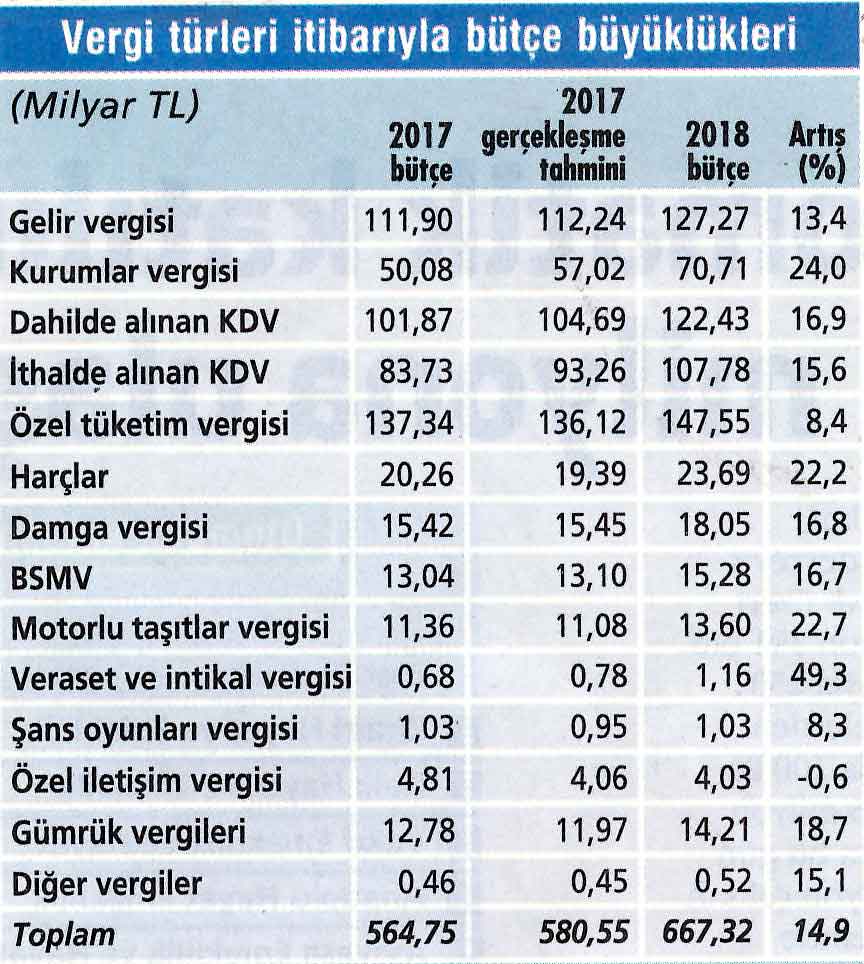 Vergi türleri itibarıyla 2018 bütçe büyüklükleri ve bunların 2017 yıl sonu gerçekleşme tahminleriyle (8 aylık gerçekleşmelere göre) karşılaştırılması karşı sayfadaki tabloda dikkatinize sunuluyor. Tablodaki vergi gelirleri red ve iadeler dahil rakamlardır. Red ve iadeler düşüldükten sonra vergi gelirleri toplamı; 2017 bütçesinde 511,1 milyar lira, 2017 gerçekleşme tahmininde 520,5 milyar lira ve 2018 bütçesinde 599,4 milyar lira oluyor.