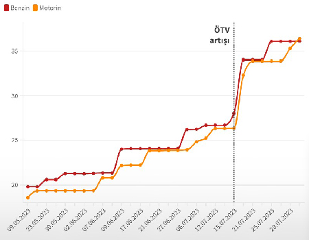 Akaryakıtta 16 Temmuz'da Resmi Gazete'de yayımlanan Cumhurbaşkanı kararıyla 5 TL'lik ÖTV artışı gerçekleştirilmiş, KDV'nin de dahil edilmesiyle litre fiyatlarına artış 6 TL olarak yansımıştı.