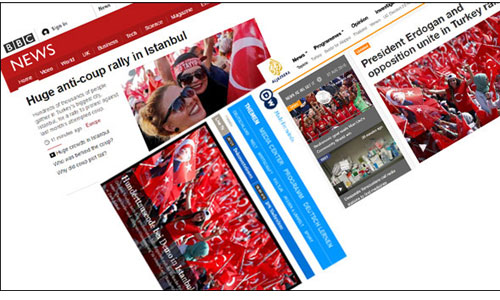 Reuters ise Yenikapı’daki büyük mitingi okuyucularına, “Yüz binlerce Türk, Cumhurbaşkanı Recep Tayyip Erdoğan’ın çağrısıyla başarısız darbe girişimini lanetlemek için toplanıyor” şeklinde duyurdu. Reuters’ın haberinde Ordu’dan gelerek Yenikapı’daki mitinge katılan 46 yaşındaki Hacı Mehmet Haliloğlu’nun, “Buradayız çünkü bu bayraklar inmeyecek, ezanlarımız susmayacak, ülkemiz bölünmeyecek.” ifadelerine yer vermesi dikkati çekti.