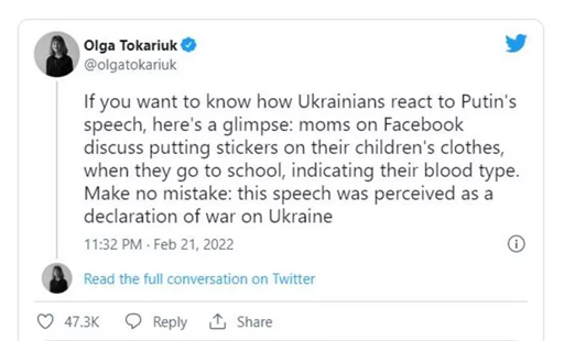 Kan grubu etiketleri ilk başta Facebook'taki kapalı gruplarda bir tartışma konusuydu ancak şimdi birçok okul bunu zorunlu hale getirdi bile. Ukraynalı gazeteci Olga Tokariuk paylaştığı bir tweette Putin'in konuşmasının Ukrayna halkı tarafından "savaş ilanı" olarak görüldüğünü ve ailelerin çocuklarını daha hazırlıklı olarak okula gönderdiklerini söyledi.