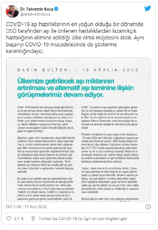 Korona virüs Bilim Kurulu toplantısı sonrası Sağlık Bakanı Fahrettin Koca imzası ile açıklama geldi. Bakan Koca, "Kovid-19 aşısının ve aşı yapabilme yeteneğinin gündemin en üst noktasına oturduğu bu günde Dünya Sağlık Örgütü, verdiği müjde ile azmimizi bir kat daha artırmıştır." ifadelerini kullandı.